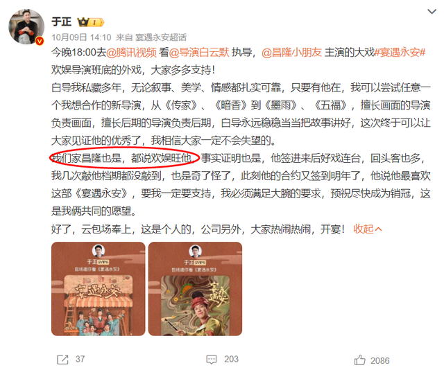 于正表示:昌隆签约欢娱之后,事业发展的非常好,自己和他约好几部戏,但都因为档期问题错过了,此刻他的合约又签到明年了,昌隆表示自己最喜欢《宴遇永安》,所以于正才会大力支持。